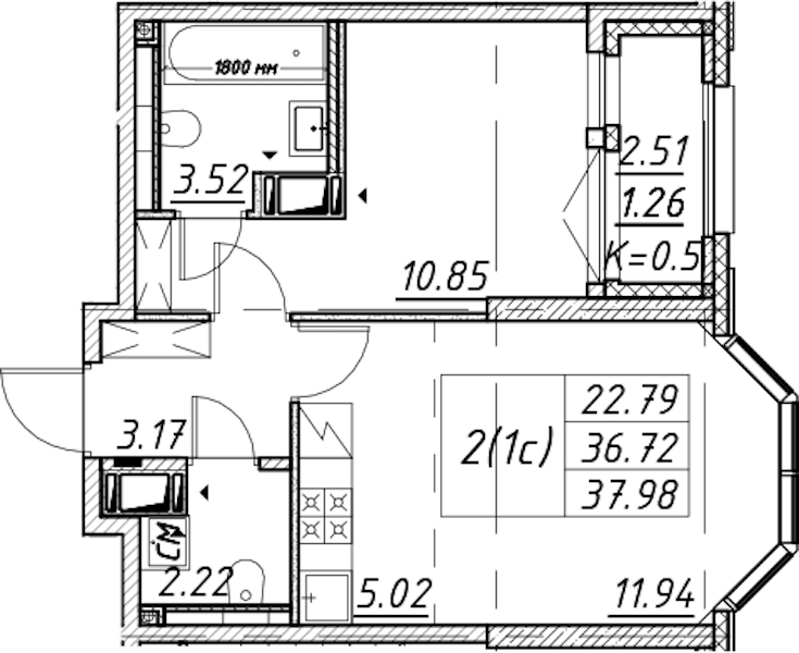 Однокомнатная квартира на 7-ом этаже 37,98 кв.м