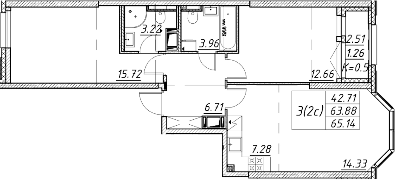 Двухкомнатная квартира на 7-ом этаже 65,14 кв.м