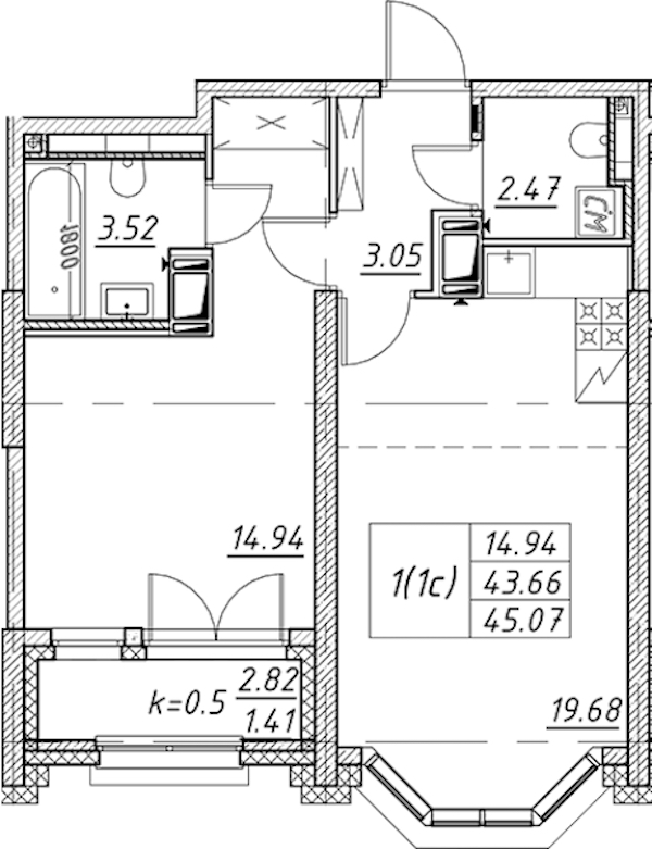 Однокомнатная квартира на 14-ом этаже 45,07 кв.м