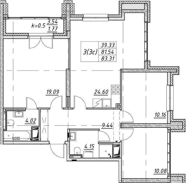 Трёхкомнатная квартира на 22-ом этаже 83,31 кв.м