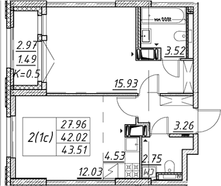 - Площадь43,51 м2