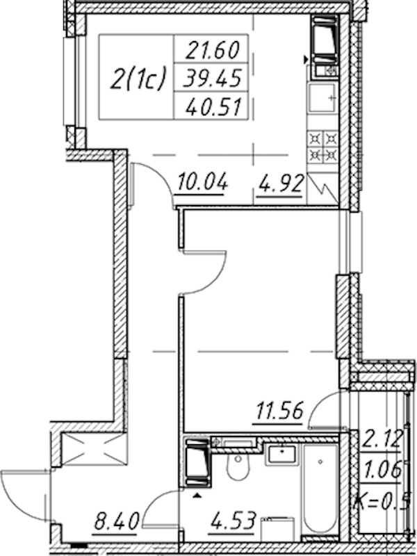 Однокомнатная квартира на 10-ом этаже 40,51 кв.м