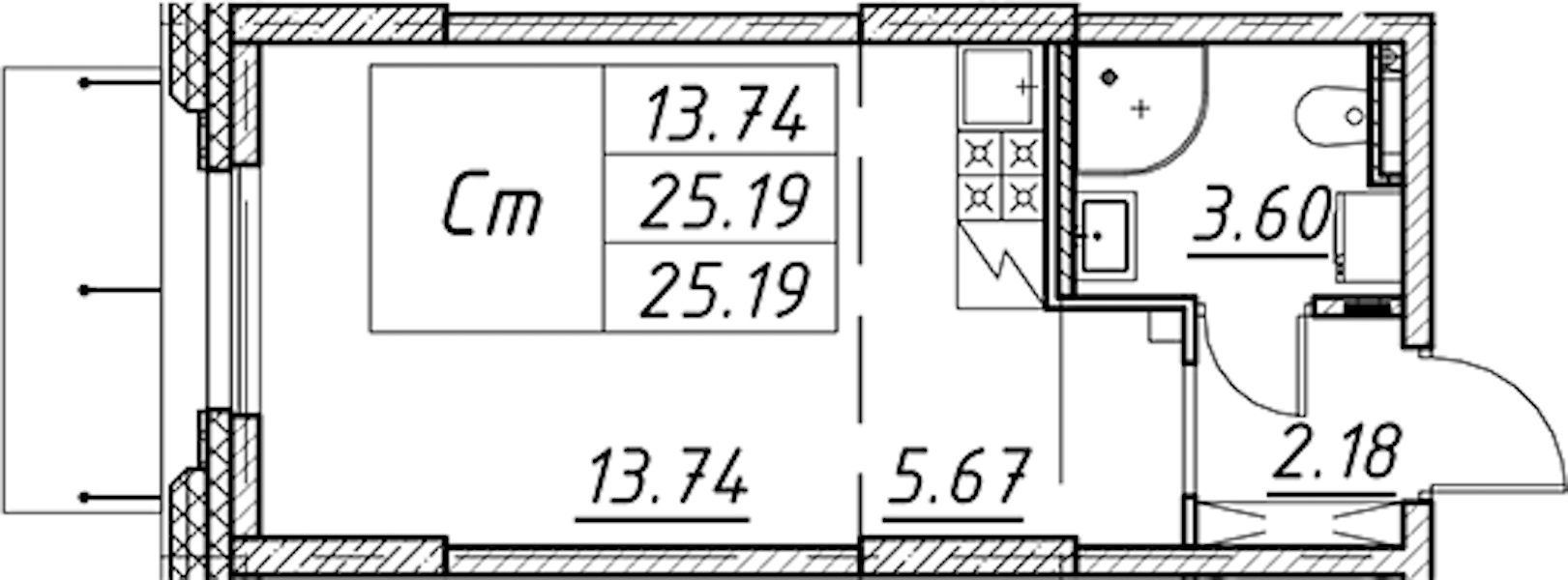 Квартира-студия на 2-ом этаже 25,19 кв.м