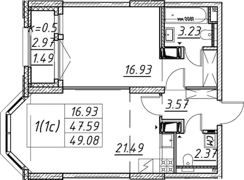 Однокомнатная квартира на 8-ом этаже 49,08 кв.м