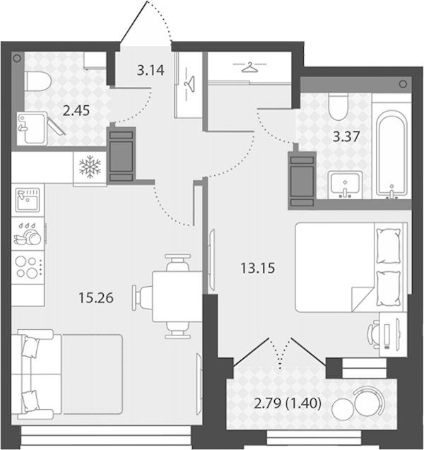 - Площадь кухни15,26 м2