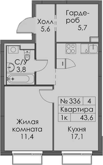 • Площадь43,6 м2