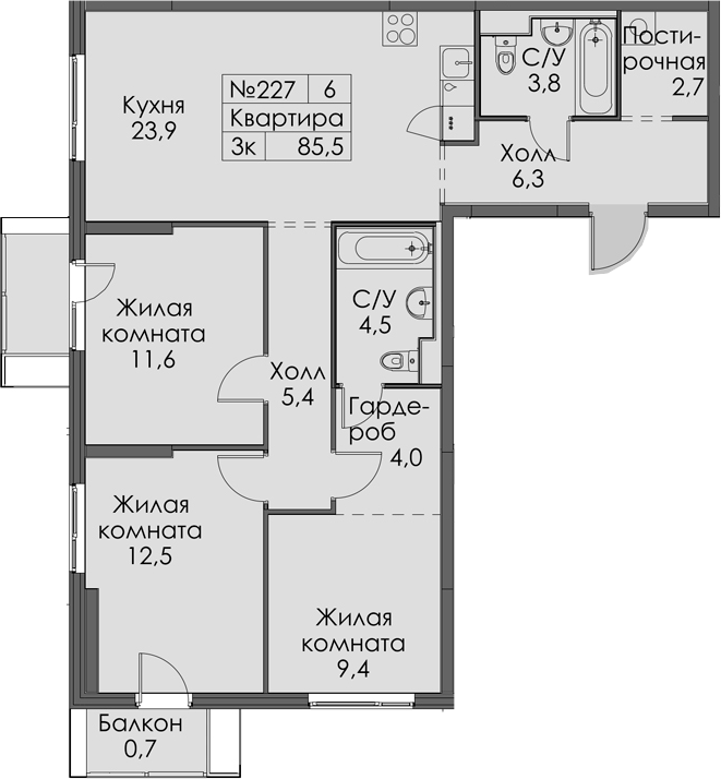 Трёхкомнатная квартира на 9-ом этаже 85,5 кв.м