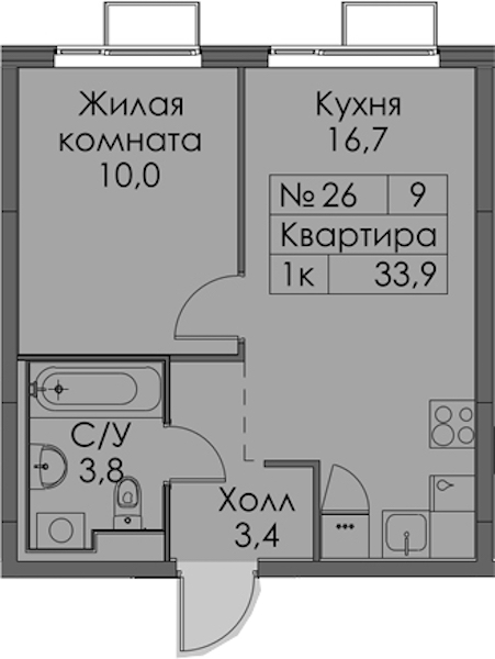 Однокомнатная квартира на 10-ом этаже 33,9 кв.м