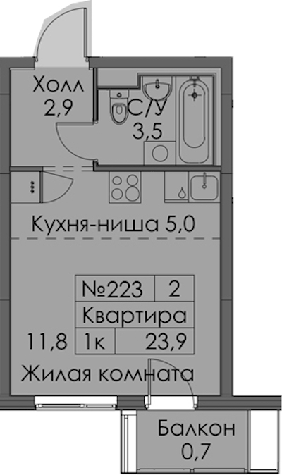 Квартира-студия на 6-ом этаже 23,9 кв.м