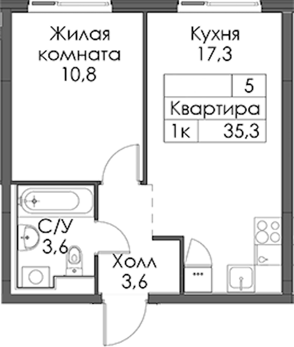 Однокомнатная квартира на 6-ом этаже 35,3 кв.м