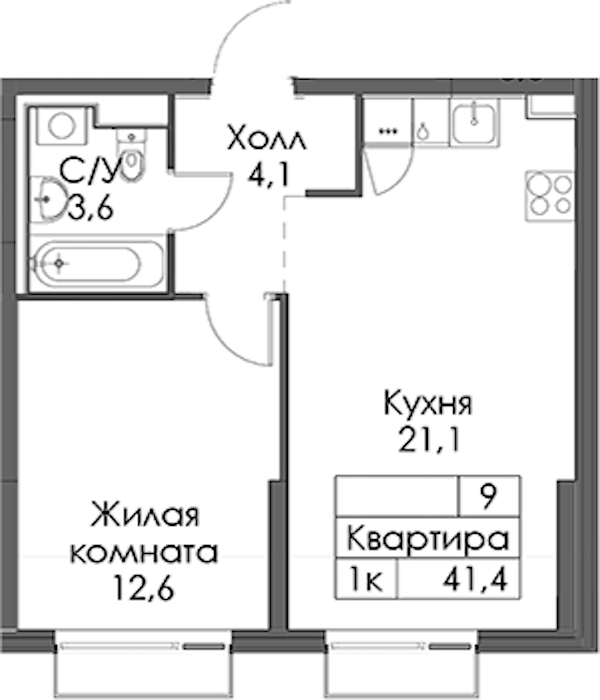 Однокомнатная квартира на 12-ом этаже 41,4 кв.м