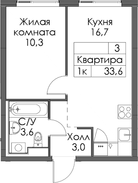 Однокомнатная квартира на 3-ем этаже 33,6 кв.м