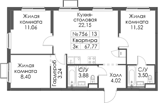 Трёхкомнатная квартира на 11-ом этаже 67,77 кв.м