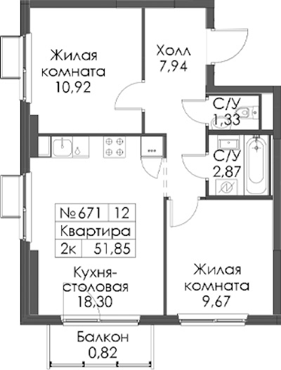 Двухкомнатная квартира на 5-ом этаже 51,85 кв.м
