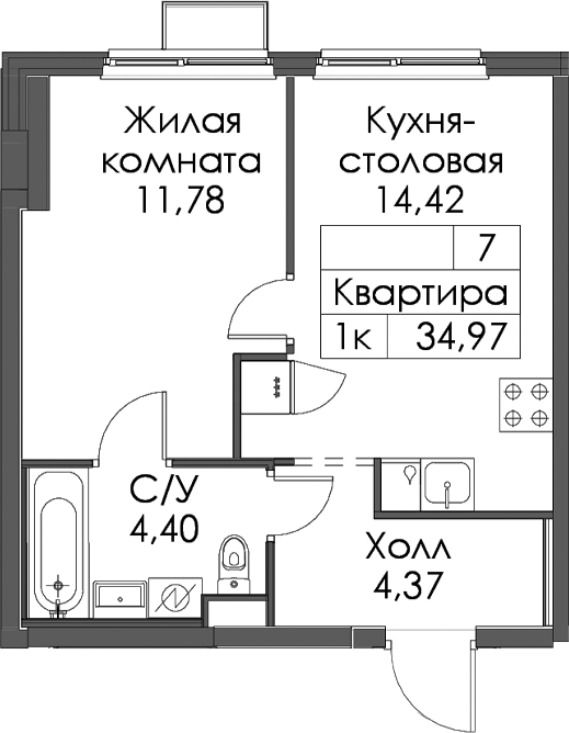 • Площадь34,97 м2