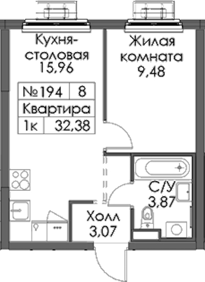 Однокомнатная квартира на 11-ом этаже 32,38 кв.м